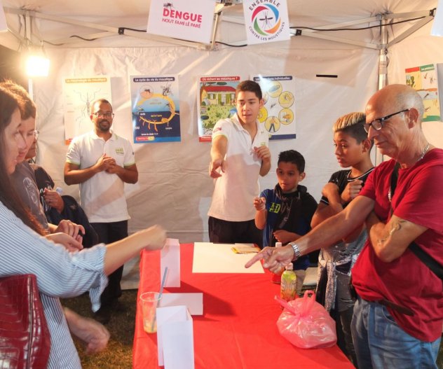 Aujourd’hui le 18 décembre, se déroule la journée départementale de Lutte contre la Dengue, événement organisé par la Préfecture de La Réunion et l’ARS-OI. La Croix-Rouge française à La Réunion s’est engagée sur l’année 2018 dans la lutte contre la dengue en partenariat avec l’Agence Régionale de Santé. L’association a organisé des journées de sensibilisation auprès du grand public et des visites en porte à porte dans les foyers à risque. Ainsi 744 habitations ont été visitées par les bénévoles de la Croix-Rouge qui ont porté des messages de sensibilisation et travaillé sur l’identification et la destruction de 439 gites larvaires. Par ailleurs, un jeu pédagogique « Buzz la Dengue » a été créé pour sensibiliser sur la maladie et les mesures de prévention. De plus, la Croix-Rouge diffuse des messages d’information à toutes les personnes accueillies dans ses structures (EHPAD, MECS, SSIAD) ainsi que dans le cadre des activités bénévoles (dispositifs prévisionnels de secours, maraudes, aide alimentaire, vesti-boutiques, etc.). Sur l’année 2019 la Croix-Rouge française à La Réunion va prolonger son engagement dans les activités de lutte contre la dengue en multipliant les événements de sensibilisation.